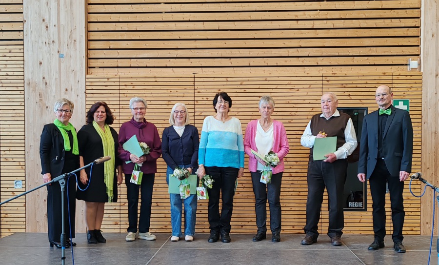 Auf 50 Jahre Mitgliedschaft können Hildegard Häckel, Helmut Heuberger und Hans Maier zurückblicken – ebenso die ehemaligen Chormitglieder Inge Kriegler, Sonja Mailänder, Lotte Preiß und Karin Preißing.